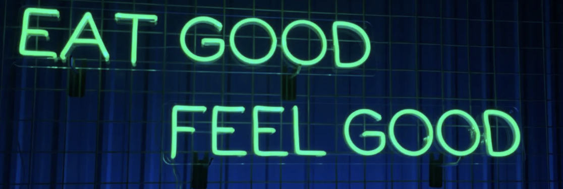 Neon sign reading 'EAT GOOD FEEL GOOD' in green lights on a blue grid background.